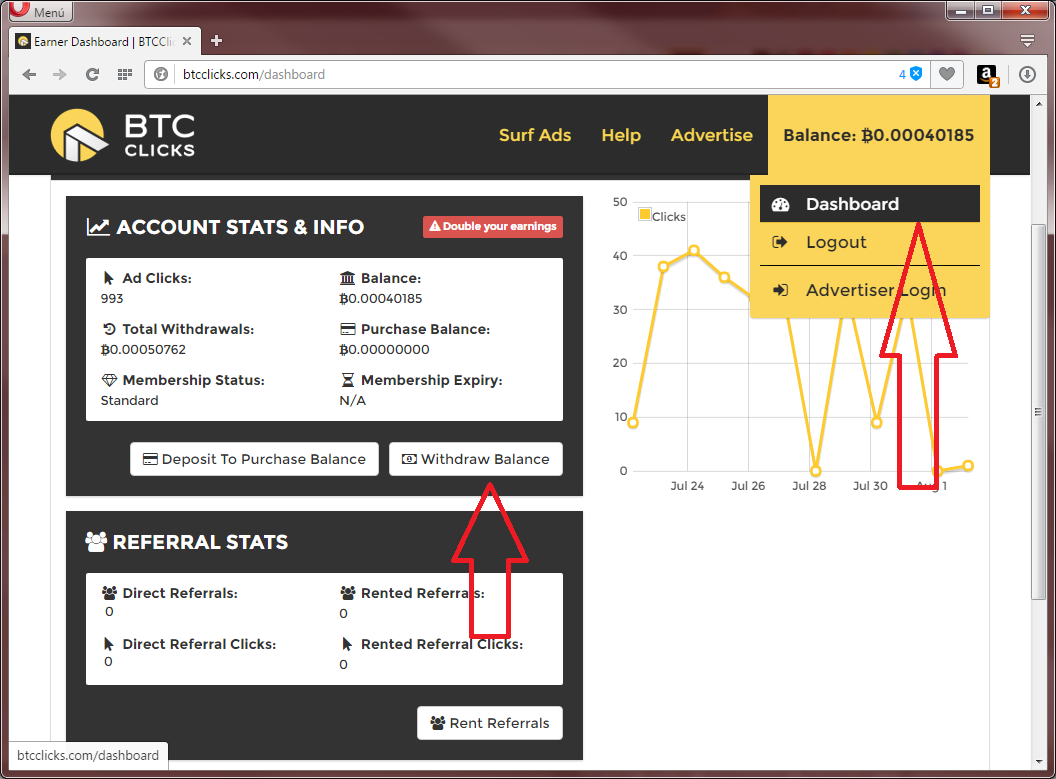 1. Ponga el puntero de mouse donde está el Balance, y haga click sobre la opción Dashboard luego haga click sobre el botón que dice Withdraw Balance.